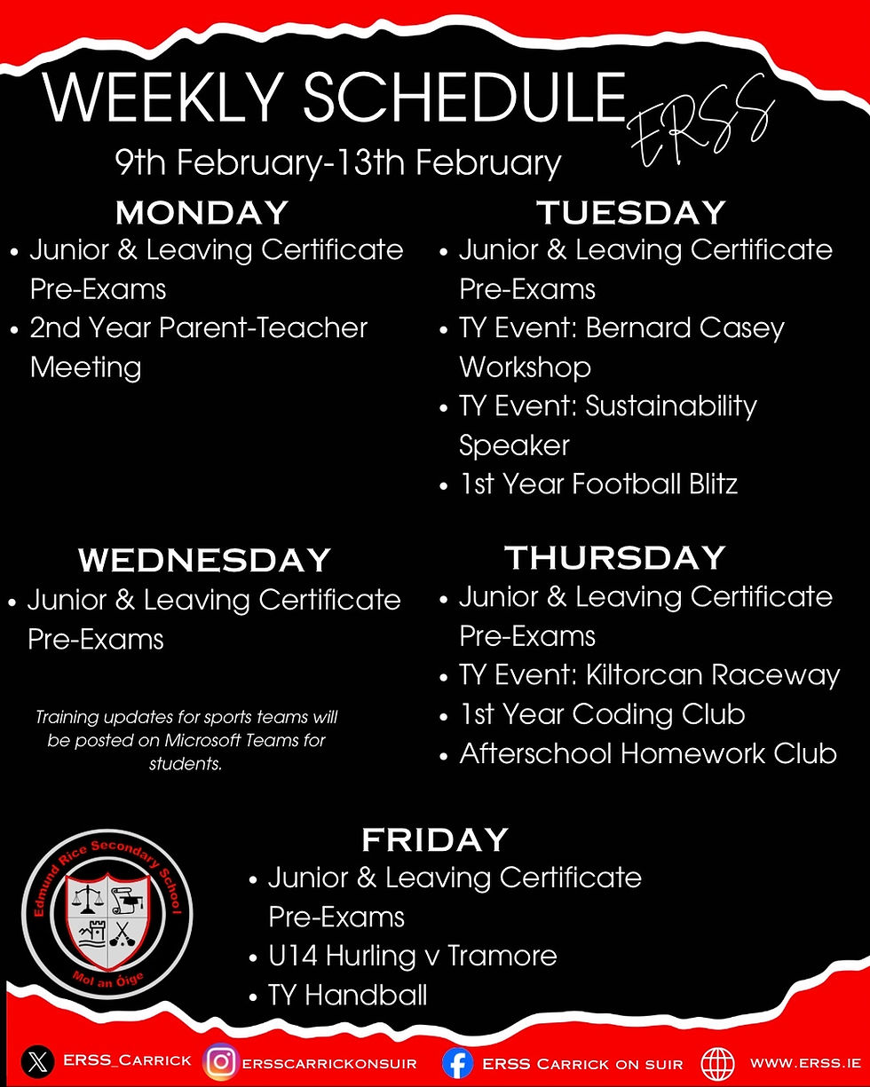 📅 ERSS Weekly Schedule | 9th–13th February Please see this week’s schedule for key events and activities, including: Junior & Leaving Certificate Pre-Exams TY workshops and trips Sports fixtures 1st Year Coding Club Afterschool Homework Club Best of luck to all students sitting pre-exams this week 👏 #ERSS